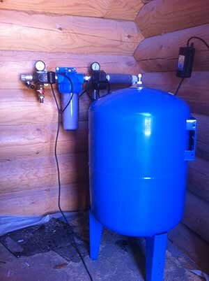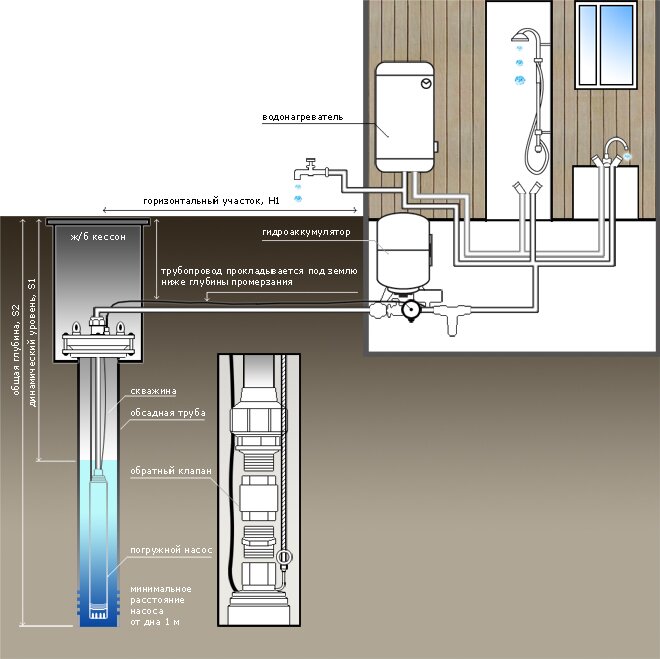 Вокруг скважины копается котлован глубиной 2 метра и устанавливается кессон. Водопроводная труба проходит на глубине 2 метра и вводится в дом. В котельной устанавливается гидроаккумулятор и комплект автоматики. В результате вы получаете воду из крана в доме, как в городской квартире. У вас круглый год будет дома вода, вне зависимости не от чего. Возможен вариант ввода в дом без земляных работ по поверхности земли, с использованием греющего кабеля внутри водопроводной трубы.